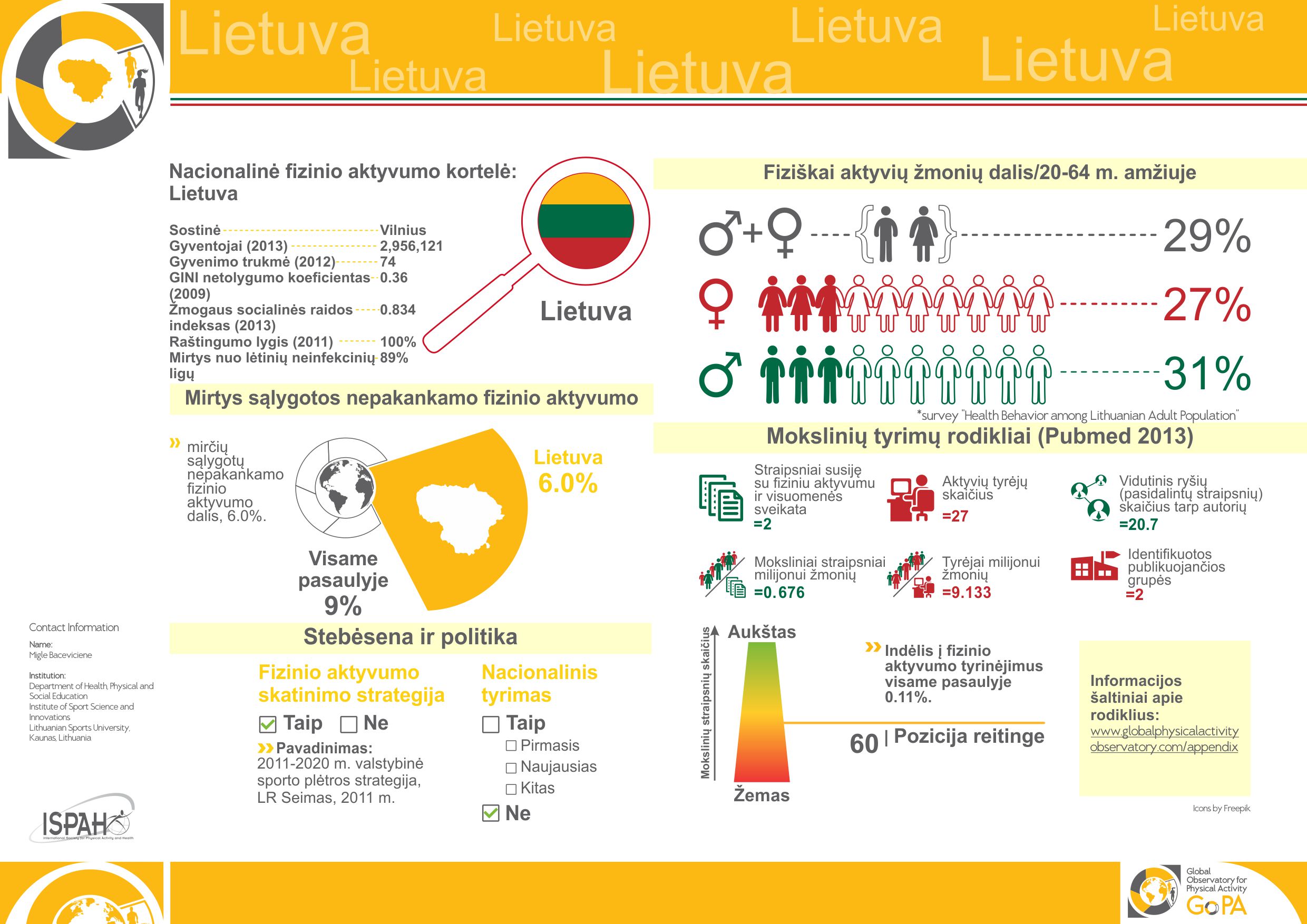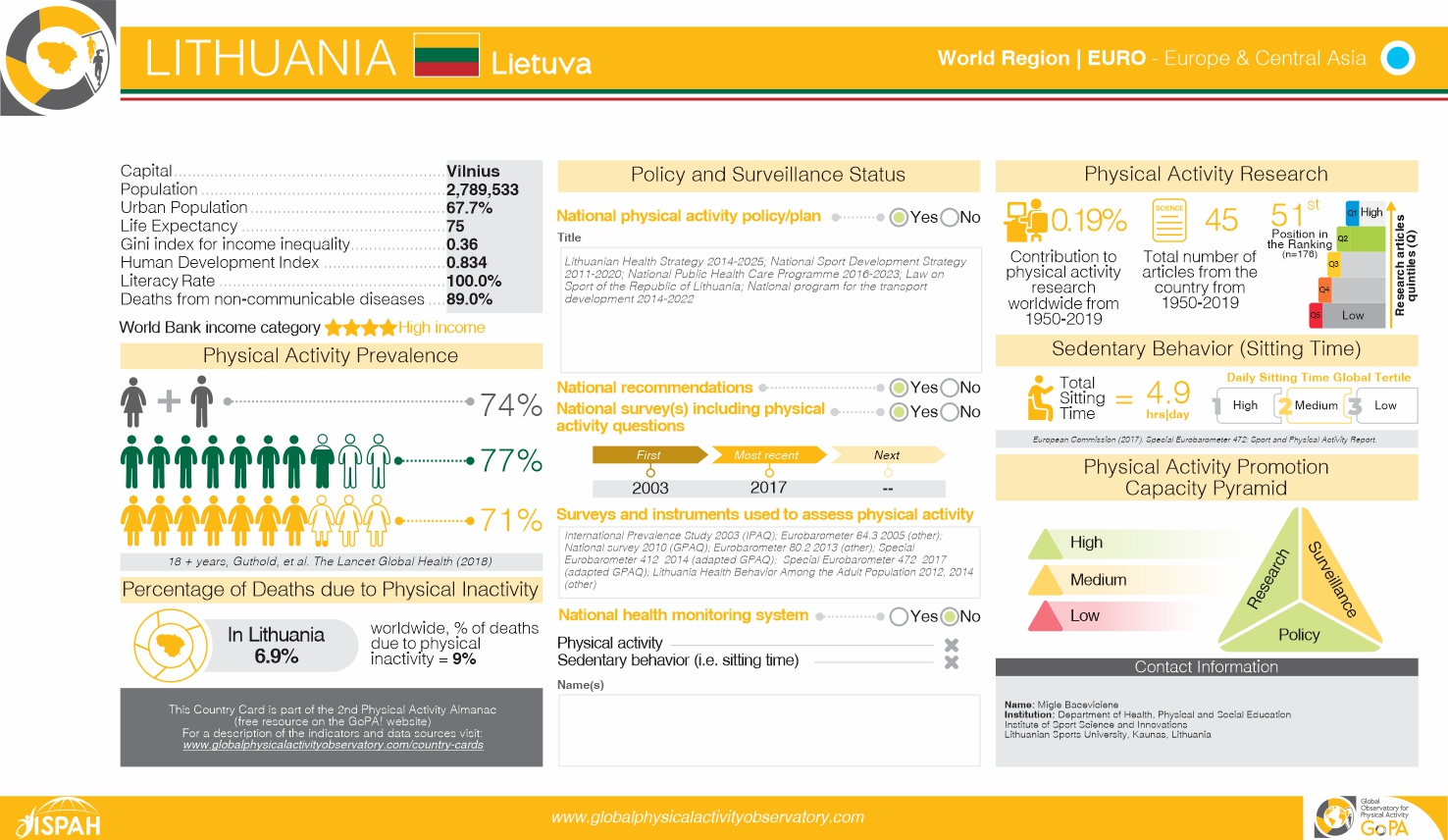 ContactMigle BacevicieneDepartment of Physical and Social Education Lithuanian Sports University Kaunas Lithuania AcknowledgmentsRasa JankauskienèLinks of InterestNational Surveys Including PhysicalActivity Questions [1] Physical Activity Prevalence [1] [2] Docs. of Interest 2015[1]through their appendix: 2020 general and 2020 detailed appendix; and 2015 general and 2015 detailed appendix. | Current English version ![]() Translated version ![]() | Previous English version ![]() Translated version ![]() |